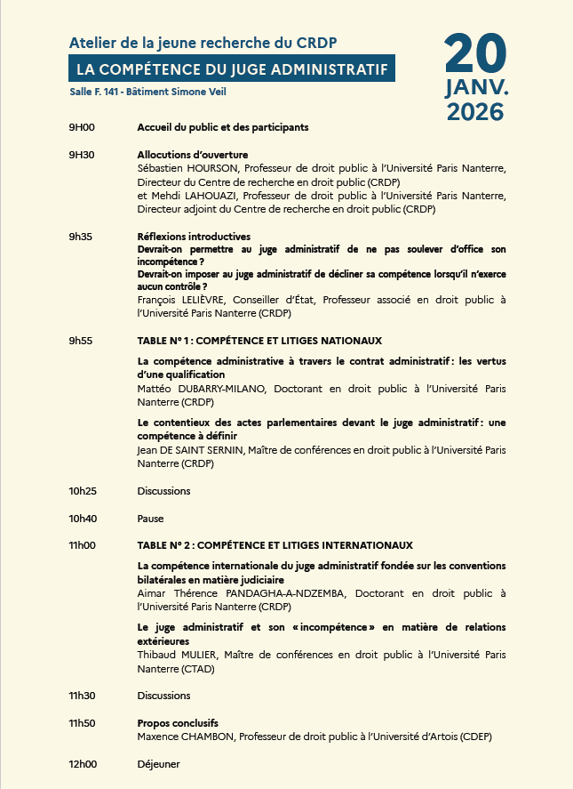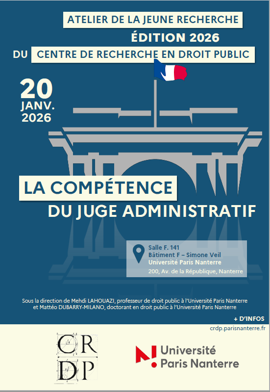 L’atelier de la jeune recherche du CRDP se tiendra le mardi 20 janvier 2026 et portera sur la question fondamentale de la compétence du juge administratif.