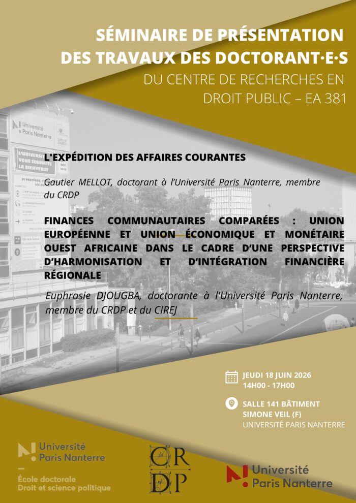 Le prochain séminaire dédié aux travaux des doctorants se déroulera le jeudi 18 juin 2026, de 14h à 17h, en salle 141.